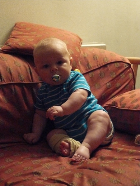 Yes, he really is as round and cute as he looks in that picture (20 pounds of roundness and cuteness, to be exact). He has started trying to sit up by himself and roll over and, though he’s currently quite frustrated, with the help of a pillow he does pretty well. Here I’d lain him on his back on the right-hand pillow, and, in the course of about a minute, he’d dragged himself up, smiled, and made a graceful nosedive into the couch.
