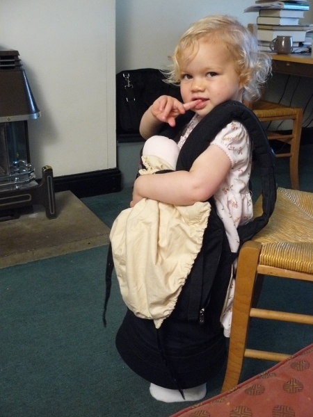 Katherine, meanwhile, is really into being helpful. She is finally learning to play well with Nathaniel. As you can see, she also has the backpack figured out. She was so shyly proud of herself as she walked around with her doll in it that I didn’t know whether to laugh or get all sentimental.