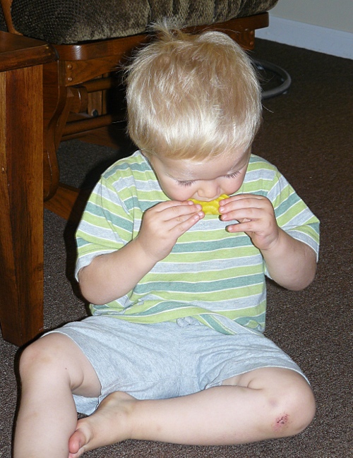 A couple of years ago I took a lovely photo of Katherine chewing on a raw beet. Now it’s Nathaniel’s turn. He has recently really taken to eating raw beet slices. Yellow beets in this case: